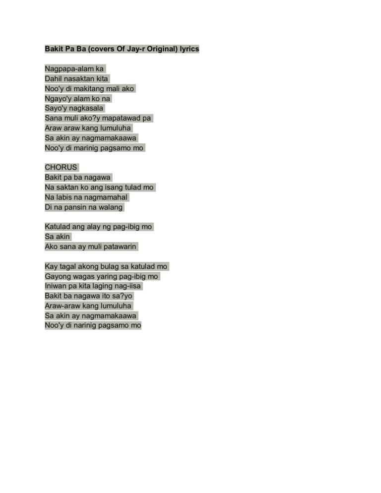 Koro Bakit pa ba nagawa Nasaktan ko ang isang tulad mo na labis na nagma-mahal Di napansin na wala Katulad ang alay ng pag-ibig mo sa. His twitter is jayr305 2 DJ Jay-R is the mashup guy. Jay R - Bakit Pa Ba translation in English Musixmatch Lyrics and Translation Bakit Pa Ba Original Lyrics Translation in English Oh woah yeah.
